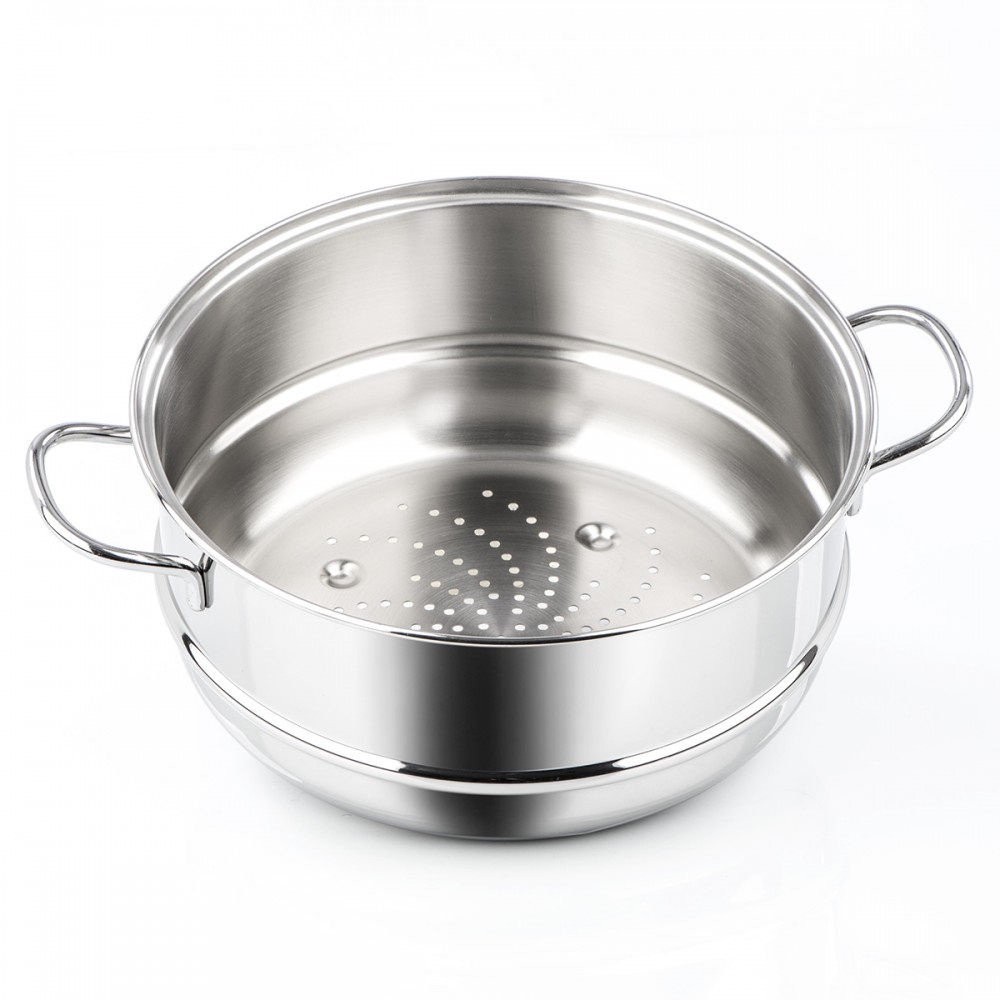 Gefertigt aus rostfreiem Edelstahl 18/10, gewährleistet dieser Korbsteamer eine hohe Beständigkeit gegen Korrosion und eine lange Lebensdauer auch bei intensiver Nutzung. Die Konstruktion basiert auf dem TRIPLEN BOTTOM: Der Boden besteht aus einer Aluminiumschicht, die vollständig von einer Stahlscheibe umhüllt ist. Diese Technologie verbessert die Wärmeleitfähigkeit erheblich und sorgt für eine gleichmäßige Hitzeverteilung über die gesamte Fläche, wodurch die Gefahr von punktuellem Anbrennen minimiert wird.Der Barazzoni Bonita Korbsteamer ist für alle gängigen Kochfelder geeignet, einschließlich Induktion, Gas, Elektro und Glaskeramik. Die ergonomisch gestalteten Griffe bieten einen sicheren Halt und bleiben auch bei längerem Gebrauch angenehm kühl. Die durchdachte Gestaltung des Korbsteamer ermöglicht ein einfaches Einsetzen und Entnehmen von Speisen sowie eine effiziente Dampfzirkulation.Die Oberfläche aus Edelstahl ist pflegeleicht und resistent gegenüber Verfärbungen und Speiseresten. Der Bonita Korbsteamer eignet sich ideal für die schonende Zubereitung von Gemüse, Fisch und anderen Lebensmitteln im Dampf. Kompatibel mit der gesamten Barazzoni Bonita Linie, lässt sich der Korbsteamer flexibel in bestehende Kochsysteme integrieren. Alle Komponenten sind spülmaschinengeeignet und erfüllen höchste Anforderungen an Hygiene und Funktionalität.