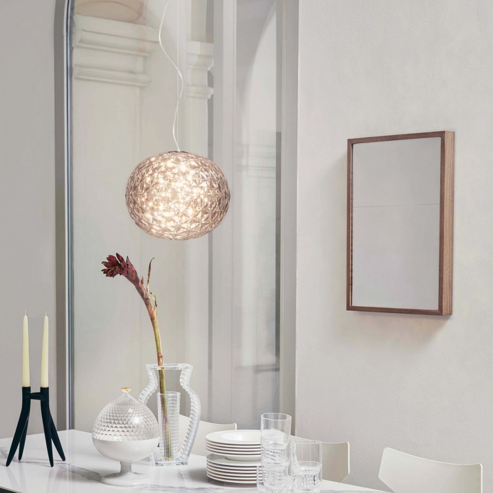 Planet von Kartell, entworfen von Tokujin Yoshioka, bringt eine neue Sichtweise in die Beleuchtung. Die ovale Form des Diffusors aus transparentem oder durchgefärbtem thermoplastischem Technopolymer ist innen und außen mit geometrischen Facetten versehen, die Licht und Reflexe sanft im Raum verteilen. Ein Rahmen aus druckgegossenem Aluminium, wahlweise verspiegelt oder lackiert, hält die Leuchte dezent zurückhaltend. Das integrierte 19-Watt-LED-Modul (2700K, 1570 Lumen, CRI 90) sorgt für angenehmes, einhüllendes Licht, das in moderne ebenso wie in klassischere Einrichtungen passt. Mit ihrem reduzierten Design und der sorgfältigen Materialauswahl wird Planet zum prägenden Element jeder Raumgestaltung.