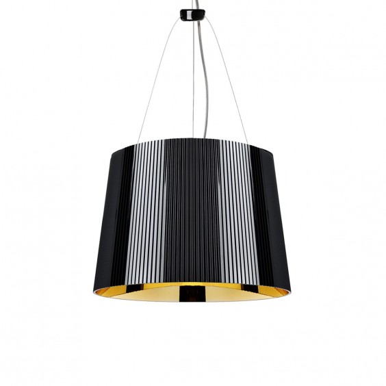 Gè Metallizzata, entworfen von Ferruccio Laviani für Kartell, interpretiert die dekorative Pendelleuchte mit einem modernen Blick auf traditionelle Formen. Der plissierte Schirm besteht aus 2.0 Polycarbonat, das aus erneuerbaren Materialien gewonnen wird, und streut das Licht sanft für eine dezente, angenehme Atmosphäre. Mit einem Durchmesser von 37 cm erinnert die Silhouette an klassische Kronleuchter aus geblasenem Glas. Das Pendel ist über ein verstellbares Kabel zwischen 45 und 230 cm höhenregulierbar. Ausgestattet mit einer 8,4W LED-Leuchte und E27-Fassung sorgt die Leuchte für effiziente und angenehme Beleuchtung – ideal für Wohnräume, Schlafzimmer oder Küchen. Die klaren Linien und zurückhaltenden Details verbinden zeitgenössische und klassische Einflüsse und rücken das Licht dezent in den Mittelpunkt des Raums.
