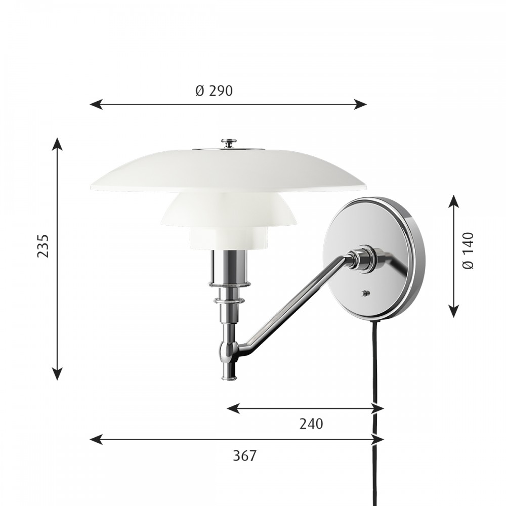 Gefertigt aus hochwertigem Opalglas und Metall, misst die PH 3/2 Wandleuchte ca. 29 cm im Durchmesser mit einer Tiefe von 28,6 cm. Sie ist für eine E14-Fassung (max. 33W Halogen oder LED, Leuchtmittel nicht enthalten) ausgelegt und bietet dimmbares, gleichmäßig diffuses Licht – ideal für Flure, Wohnzimmer, Schlafzimmer, Hotels oder Restaurants. Die verdeckte Kabelführung sorgt für ein aufgeräumtes Erscheinungsbild und unterstreicht die Vielseitigkeit und Funktionalität dieser zeitlosen Leuchte.