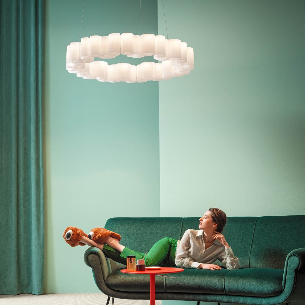 Honey Circolare von Stilnovo, gestaltet von Pio & Tito Toso, interpretiert das Prinzip modularer Formgebung mit einer harmonischen Abfolge von Aluminiumzylindern und sanft geschwungenen Diffusoren aus Milchglas. Das Licht entfaltet sich in subtilen Abstufungen, sowohl nach oben als auch nach unten, und schafft eine angenehm warme Atmosphäre. Die Pendelleuchte ist in verschiedenen Versionen erhältlich, ausgestattet mit energieeffizienter Top-LED-Technologie (35W, 49W oder 105W, 2700K, CRI90), die für eine gleichmäßige, blendfreie Ausleuchtung sorgt. Honey Circolare eignet sich für unterschiedlichste Wohn- und Arbeitsbereiche und fügt sich sowohl in moderne als auch klassische Raumkonzepte ein. Die Metallkomponenten und die sorgfältige Verarbeitung unterstreichen den hohen Anspruch an Qualität und Design.