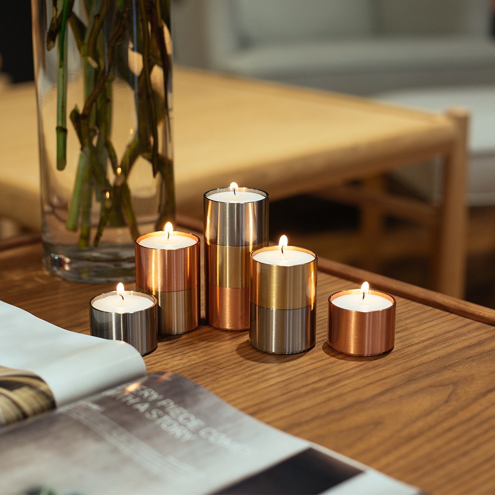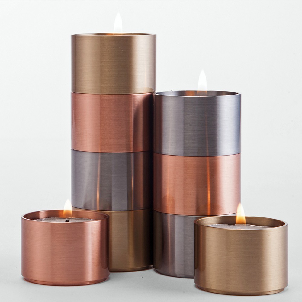 Made of solid copper, brass and stainless steel, Trepas, designed by Peter Karpf in 1966, is a system of tea light holders. Searching for the perfect vessel for this simple and universal candle, Karpf created a system of holders that can be positioned in countless ways. As the living flame within reflects off of the polished metals a“tinge of infinity”is created as its reflections bounce between holders.