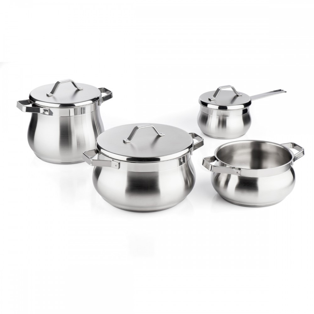 Crafted from high-grade 18/10 stainless steel, this cookware set features a satin-finished body with a polished band and ergonomically designed handles for secure, comfortable grip. The TRIPLEN BOTTOM technology comprises an aluminum core encapsulated within a steel disc, applied directly to the base of each piece. This multi-layer construction significantly enhances thermal conductivity, ensuring uniform heat distribution across the entire bottom surface and minimizing the risk of localized overheating or burning. The Barazzoni Tummy Evolution cookware set is engineered for optimal performance on all hob types, including induction, gas, electric, and ceramic. The seamlessly integrated stainless steel coating provides excellent durability, resistance to corrosion, and easy maintenance. Each element of the Tummy Evolution cookware set—including pots, casseroles, and lids—demonstrates advanced technical refinement for precise temperature control and versatile compatibility with contemporary kitchen requirements.