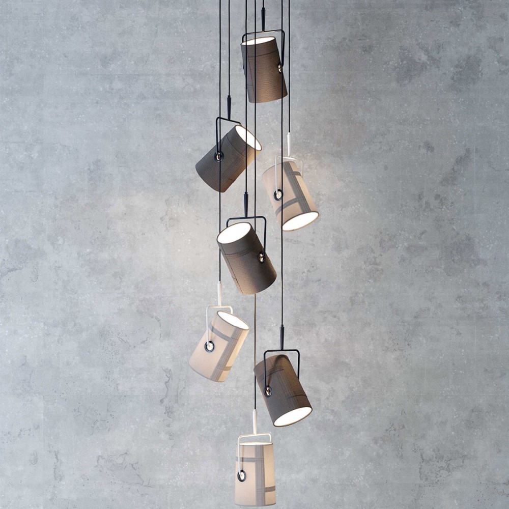 Fork Small by Diesel with Lodes reinterprets the pendant lamp with a tactile sensibility, drawing inspiration from the informal intimacy of canvas and the durability of utilitarian design. The diffuser, meticulously crafted from a cotton-linen blend in either ivory or grey, reveals a distinctive patchwork construction; visible stitching recalls the familiar texture of well-worn denim, while the fabric’s weave becomes apparent when illuminated.360-degree adjustability is achieved through robust, gunmetal-finished brass eyelets, providing a deliberate contrast to the diffuser’s softness and allowing precise orientation of the light beam. The result is a warm, ambient glow that gently defines living rooms, bedrooms, or kitchens, adapting seamlessly to modern, classic, or industrial interiors.Equipped with a single 15W E14 LED source, Fork Small pendant lamp delivers both functional and atmospheric lighting. Designed by Diesel Design, this piece demonstrates an understated fusion of material honesty and refined utility—an expressive addition to any space.
