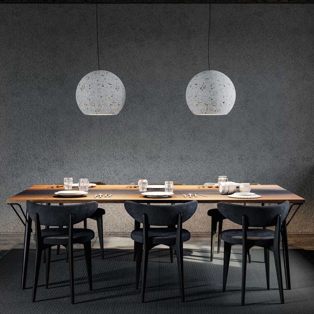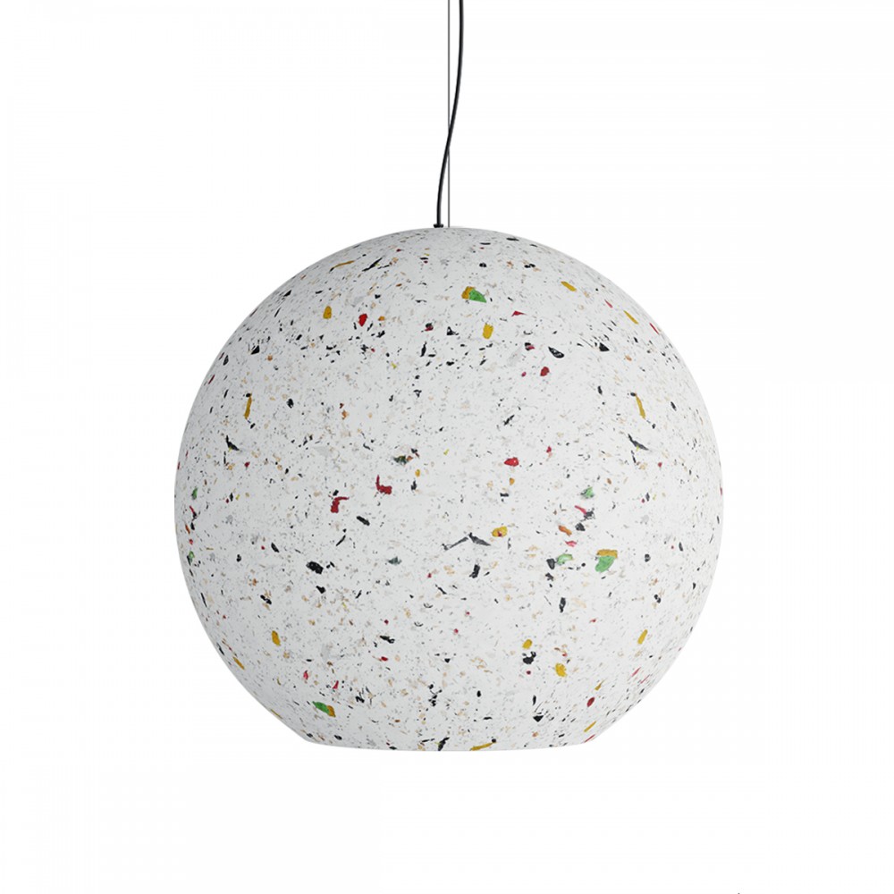 Reglobe 65 is a pendant lamp that explores the dialogue between heritage and innovation. Conceived by Diesel Design for Diesel with Lodes, Reglobe 65 emerges as a sculptural presence—its generous volume rendered ethereal through a unique rotational moulding process. This technique fuses grains of partially recycled plastic into a marbled composition, resulting in a surface where a white ground is traversed by vivid chromatic fragments. The interplay of color and texture evokes the expressive forms of the 1960s, yet remains rooted in a contemporary sensibility.Suspended with quiet confidence, Reglobe 65 offers a diffuse, ambient glow, powered by a single 25W E27 LED source. Its materiality—at once robust and light—allows the pendant to inhabit a spectrum of interiors, from modern to classic, from minimalist to eclectic. In the living room, bedroom, or kitchen, Reglobe 65 asserts its identity without imposition, inviting curiosity and reflection in equal measure. A testament to sustainable design and refined craftsmanship, the Reglobe 65 pendant lamp redefines the boundaries of recycled material, transforming production waste into a luminous object of enduring character.
