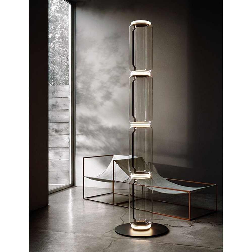 The Noctambule 3 High Cylinders Small Base floor lamp by Flos, envisioned by Konstantin Grcic, ascends like a luminous column—three hand-blown glass cylinders stacking with architectural precision atop a discreet base. By day, its transparent silhouette and subtle metal accents create a sculptural presence that complements any refined interior. When night falls, the lamp transforms, casting a warm, diffused glow that bathes living rooms, lobbies, or galleries in an atmosphere of serene sophistication and contemporary elegance.