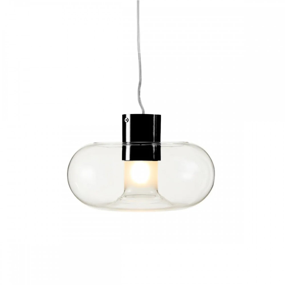 The vision of Federico Peri comes to life in the pendant lamp Fontanella for Fontana Arte—a masterful expression of refined materiality and timeless elegance. Sculpted with a harmonious interplay of metal and glass, its silhouette captivates the eye: a metal base anchors the design, while a sandblasted inner glass tube and a mouth-blown outer bubble merge in a gentle gradient from opaline to transparent. The result is a luminous centerpiece that diffuses light with a delicate, atmospheric presence, creating a warm and inviting ambiance wherever it hangs.
