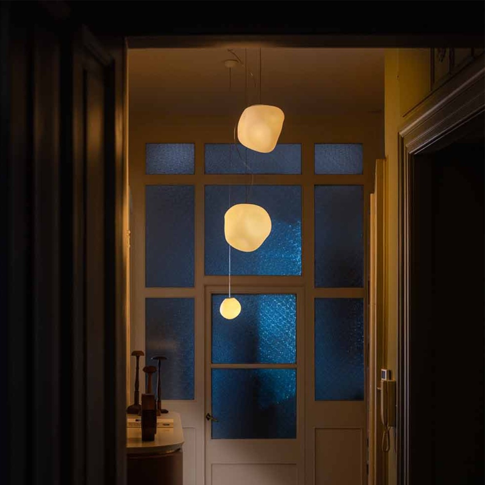 The Hoba piccola pendant lamp by Foscarini emerges as a sculptural statement in contemporary design, envisioned by Ludovica Palomba and Roberto Palomba. Its compact, organic silhouette—crafted from blown mouth-coated glass and finished with a delicate acid-etched surface—creates an atmosphere of quiet sophistication. When illuminated, the lamp diffuses a soft, warm glow that gently envelops dining rooms, living spaces, or entryways, transforming ordinary moments into refined experiences.