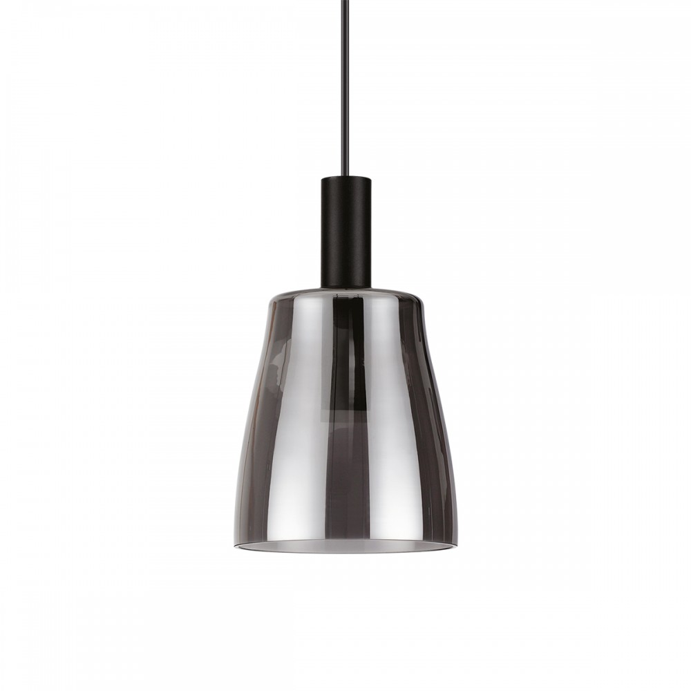 The Coco H.25 cm pendant lamp by Ideal Lux captivates with its harmonious blend of modern minimalism and visual intrigue. Its compact, rounded silhouette is defined by a sleek, powder-coated black metal structure, contrasted elegantly by a smoked transparent blown glass shade. The subtle satin edge of the transparent acrylic diffuser enhances its refined allure, casting a soft, inviting glow that transforms any setting into a space of understated sophistication and warmth.
