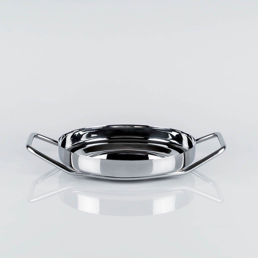 Model: Back Up saucepan / plateCollection: Back UpBrand: KnIndustrieDesigner: Rodolfo DordoniCategory: pans, Coating: stellMaterials: stainless steelHob types: Halogen, electric, gas, ceramic, ovenMeasures: 20 cm