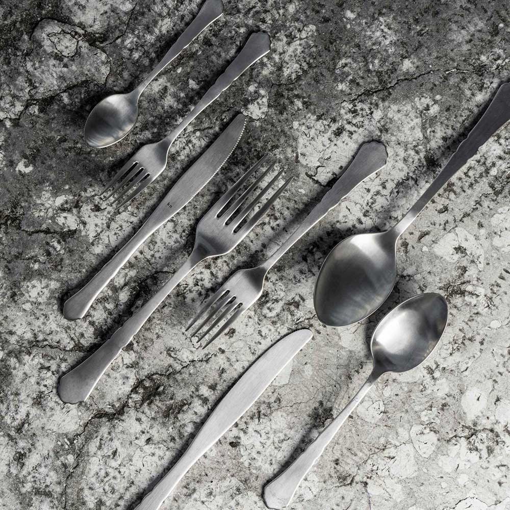 Engineered from premium stainless steel, the 700 cutlery set is distinguished by precise balance, refined contours, and enduring structural integrity. Each utensil in the 700 KnIndustrie collection is shaped for optimal weight distribution, ensuring ergonomic handling and controlled movement during use. Subtly stylized shell and leaf motifs are integrated into the handles, referencing 18th-century design language while maintaining a restrained, contemporary profile. The satin-finished surface imparts tactile smoothness and resists fingerprints, enhancing both visual harmony and hygienic performance. Designed for versatility, the cutlery set comprises a fork, spoon, table knife, fruit utensil, serving fork, and serving spoon, each calibrated to perform its function with efficiency and precision. The 700 cutlery set is suitable for both domestic and professional environments where material quality and technical execution are paramount.