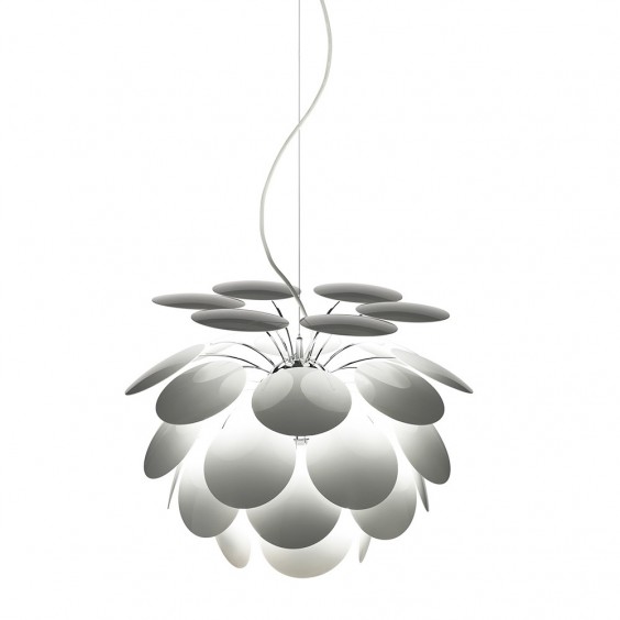 Exuberant even when switched off, the richness of the light emitted by the Discocó lamp provides direct downward illumination together with a dramatic play of light and soft shadows. Its detailed study of incident light and light bouncing off both sides of the 35 discs gives the lamp an attractive shade of light and depth. Further reflections dance on the chromed sphere in the centre, where the discs are anchored. When the light is switched off, it retains its attractive presence, hinting at the energy expansion that is fully expressed when it is switched on.