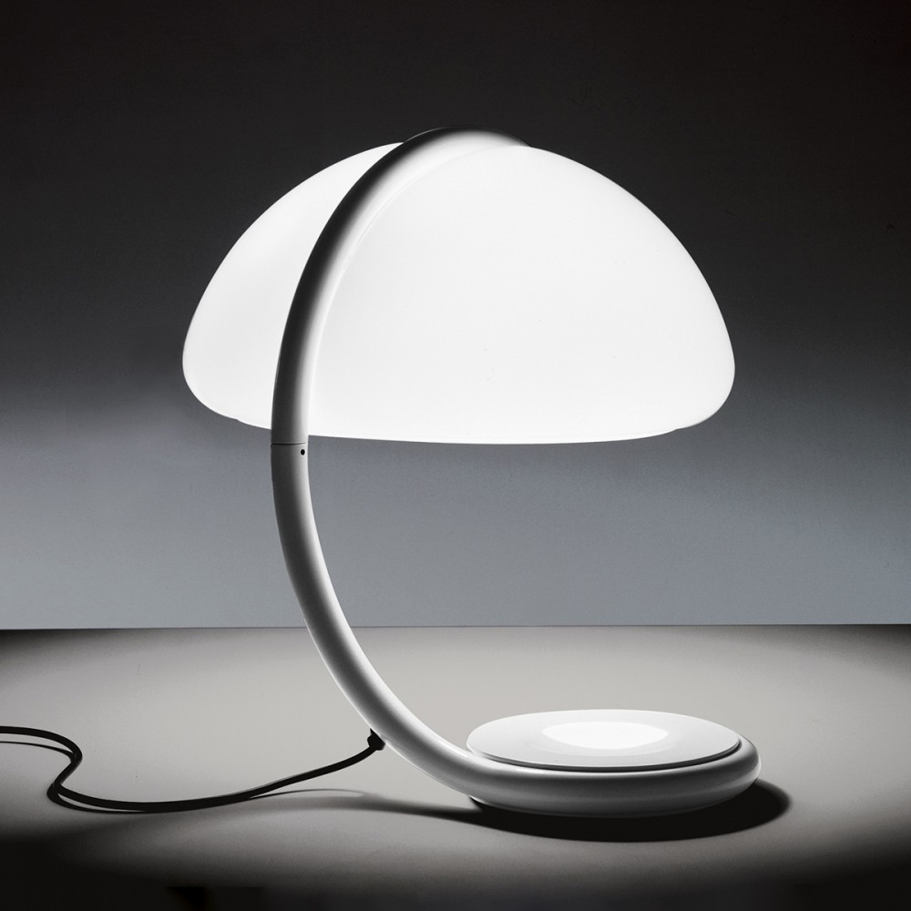 Born at the heart of 1970s Italian design, the Serpente table lamp by Martinelli Luce captures the era’s spirit of daring innovation and sculptural beauty. Designed by Elio Martinelli in 1971, its fluid, snake-like silhouette coils gracefully, casting a soft, diffused glow that transforms any room into a haven of retro-modern sophistication. The white opal methacrylate diffuser rests atop a lacquered metal base, evoking a sense of movement and elegance—making the Serpente table lamp an instant focal point in living rooms, bedrooms, or stylish lounges.