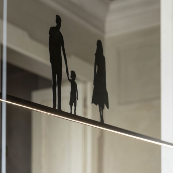 The Phil pendant lamp by Uto Balmoral for Mogg is a luminous narrative suspended in air. Defined by its slender, horizontal silhouette in black metal, Phil appears to float weightlessly, casting a warm, inviting glow that gently defines and divides space. Along its elegant length, subtle backlit silhouettes spark the imagination—evoking fleeting stories and artistic intrigue—while its refined form adds a poetic, minimalist touch to any contemporary setting.