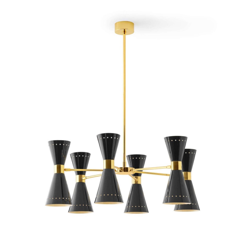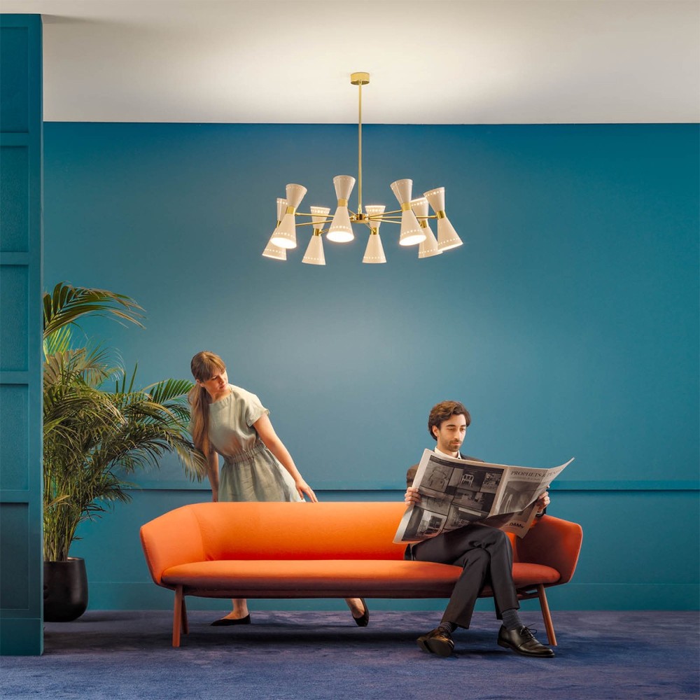 The Megafono 6x2 pendant lamp by Stilnovo Design presents a refined balance of form and function, echoing the aesthetic codes of the 1950s with a contemporary sensibility. Twelve double-cone shades, finished in ivory or glossy black, are arranged along a brass frame, allowing both direct and indirect illumination to shape the atmosphere of living, dining, or sleeping spaces. The structure—crafted in brass with galvanic gilding—offers visual warmth and a tactile presence, complemented by matching suspension rod and wire casing. Each lampshade is adjustable, lending flexibility to the composition of light throughout the room. Equipped with 12 E14 LED sources, the Megafono 6x2 pendant lamp delivers efficient, nuanced lighting, bridging modern, classic, and nordic influences in a quietly sophisticated gesture.