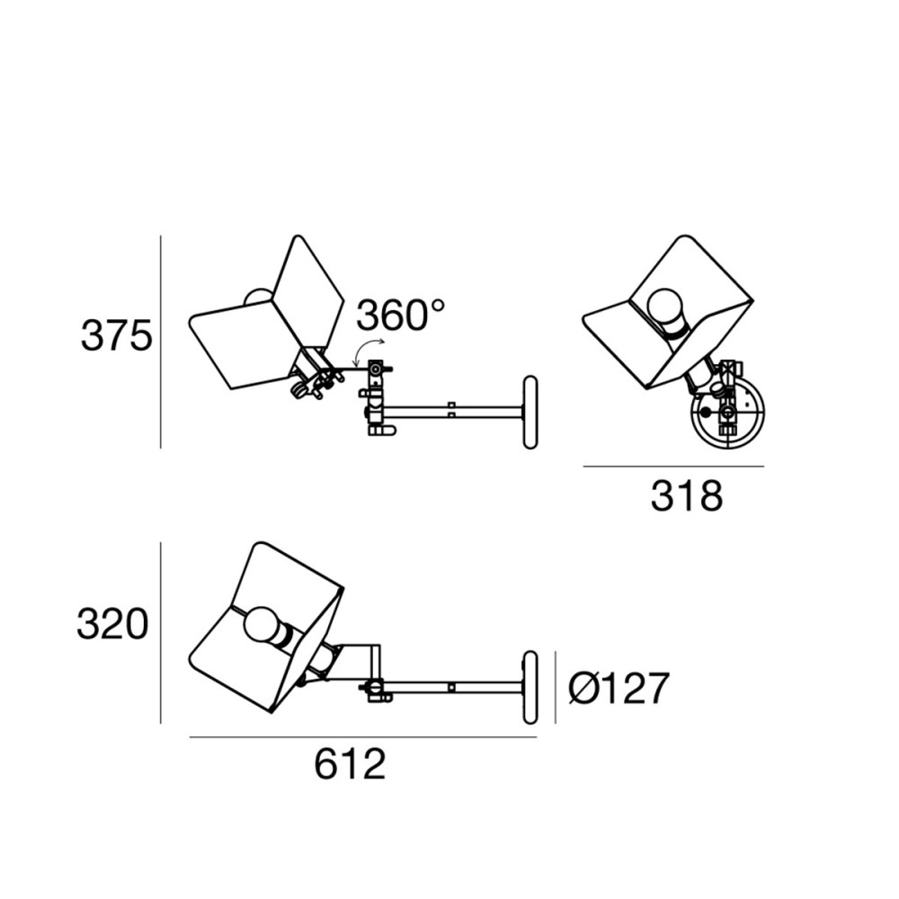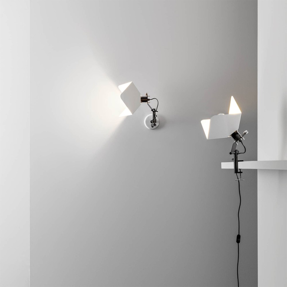 Tridero wall lamp by Joe Colombo for Stilnovo offers a contemporary approach to ambient lighting through the interplay of form and function. The distinctive lampshade, crafted from three precisely contoured and bent metal panels, softens and directs illumination with subtlety, drawing on the visual language of classic photographic equipment. A silver-domed LED bulb sits at the heart of the design, diffusing light gently downward while minimizing glare. The supporting structure features a double joint, allowing effortless adjustment of both rotation and inclination to suit diverse spatial needs. With its modern yet timeless character, the Tridero wall lamp brings understated technical sophistication to walls and ceilings in a variety of environments. The piece is completed by a 1x7W E27 LED light source, combining enduring materials with a quietly innovative spirit.
