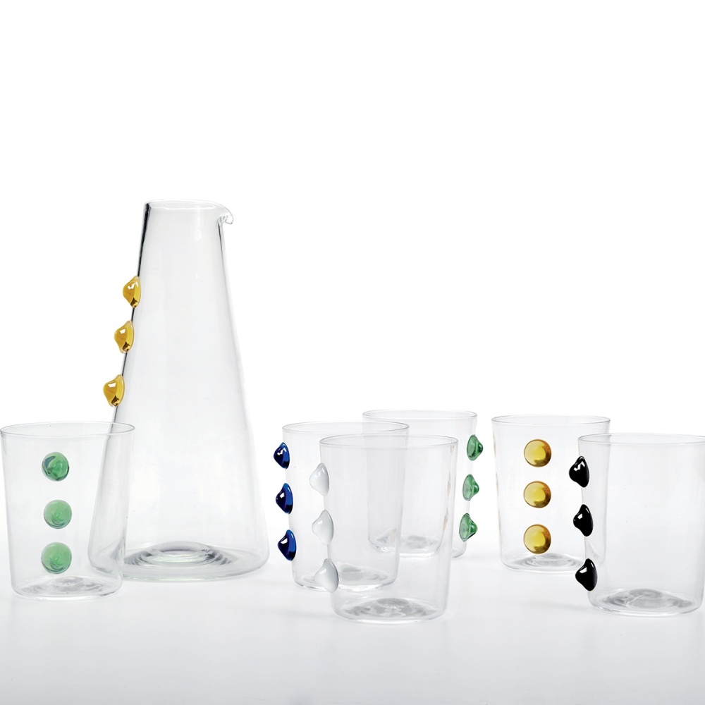 Gracefully rising from the table like a modern sculpture, the Petoni jug by Zafferano is a study in visual balance and artisanal allure. Its tall, cylindrical silhouette—crafted from transparent, hand-blown borosilicate glass—showcases three distinct, affixed elements that double as both captivating sculptural details and ergonomic grips. The interplay of smooth glass and bold accents creates a striking centerpiece, while the crystal-clear body highlights the purity of its contents, lending a sense of sophistication to any setting, from intimate brunches to celebratory feasts.