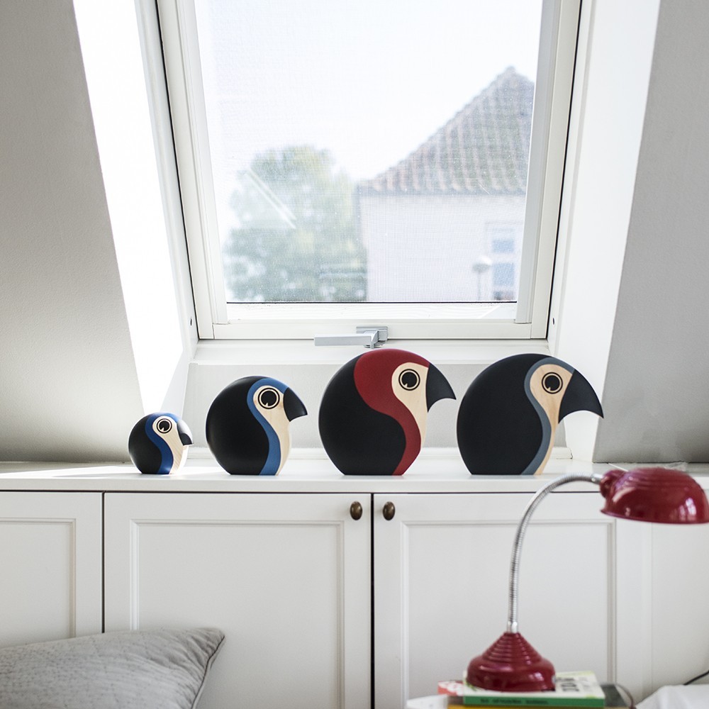 Hans Bølling ha creato Discus nel 1961. Gli uccelli hanno la forma di un disco e sono realizzati in legno di pino dipinto a mano. Le parti dipinte rappresentano il piumaggio colorato dell'uccello, mentre il petto dell'uccello rimane non dipinto, rivelando le qualità naturali del legno. Le belle venature del legno contrastano con le parti dipinte degli uccelli. Gli uccelli fanno parte di una famiglia composta da quattro membri che possono essere messi in fila nella finestra o su uno scaffale.