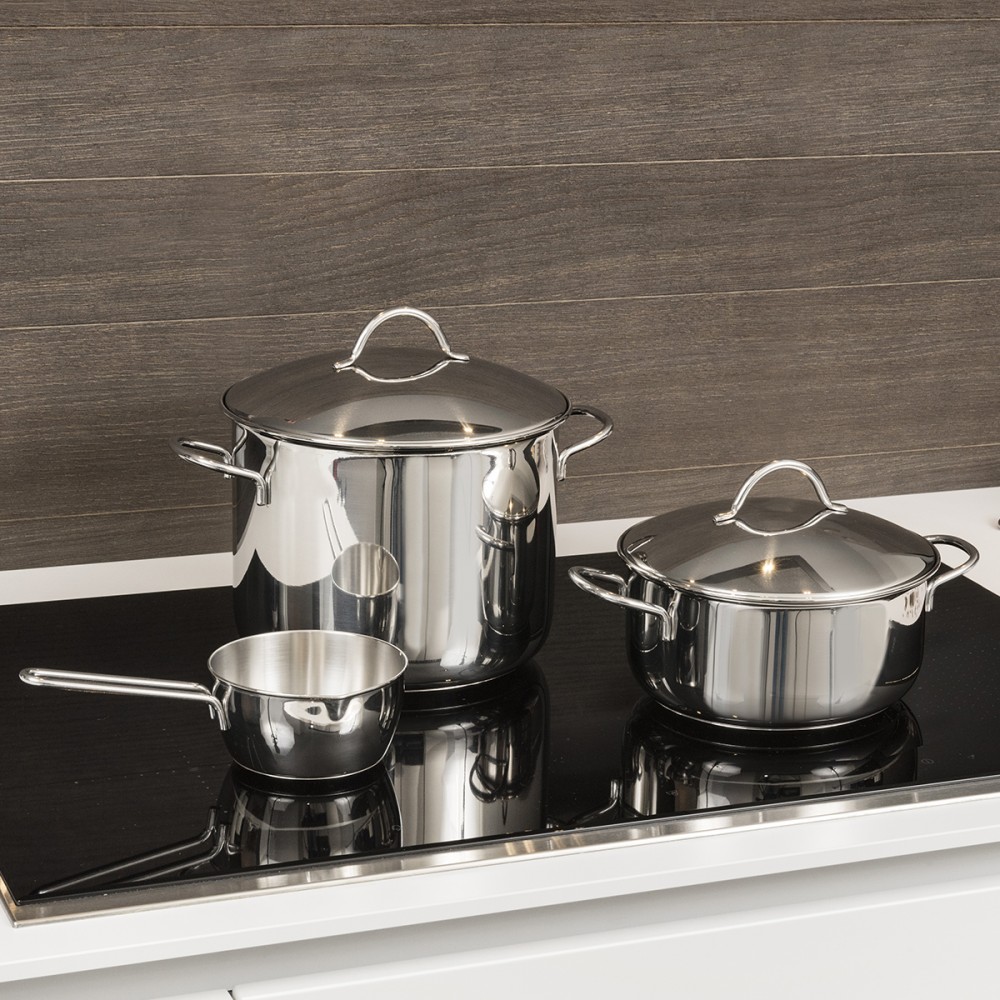 FONDO TRIPLEN - Per potenziare la conducibilità termica dell'acciaio, un fondo in alluminio incapsulato in un disco di acciaio viene applicato al corpo della pentola. Lo strato in alluminio consente una diffusione omogenea del calore su tutto il fondo e riduce i rischi di bruciature.
