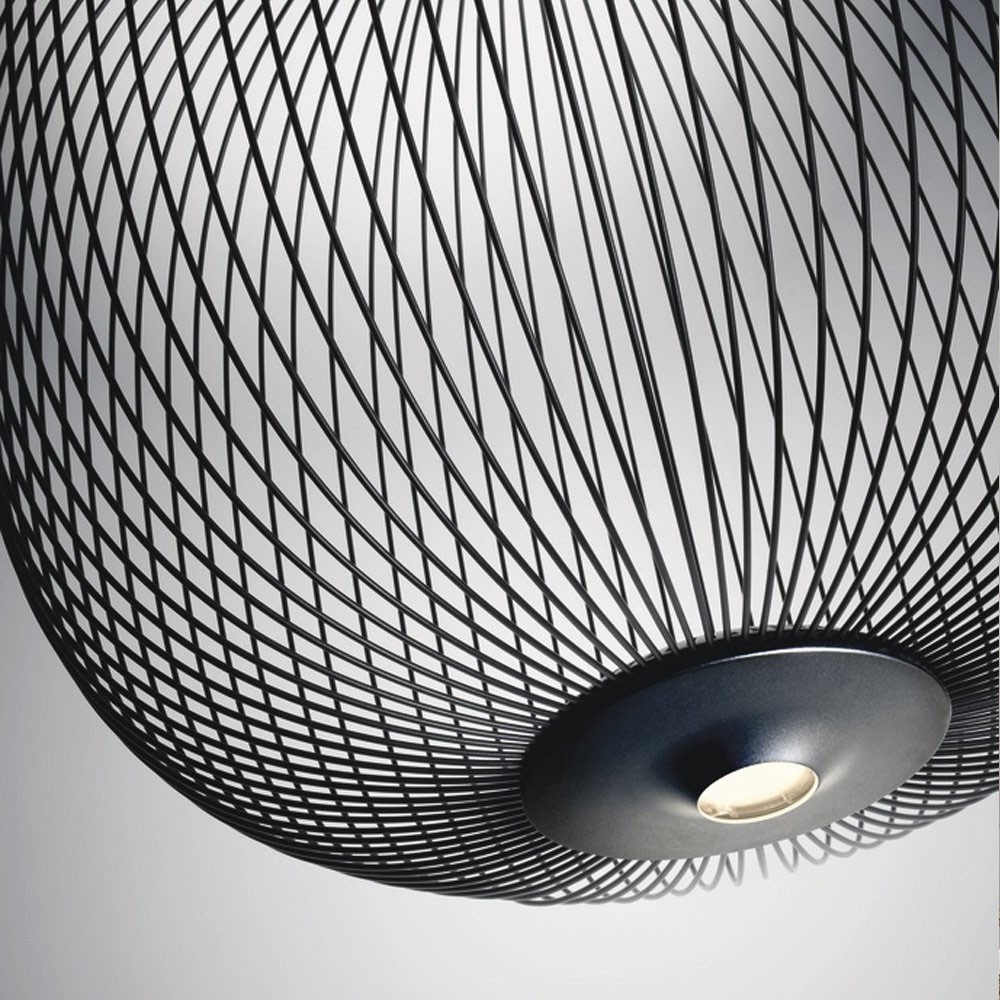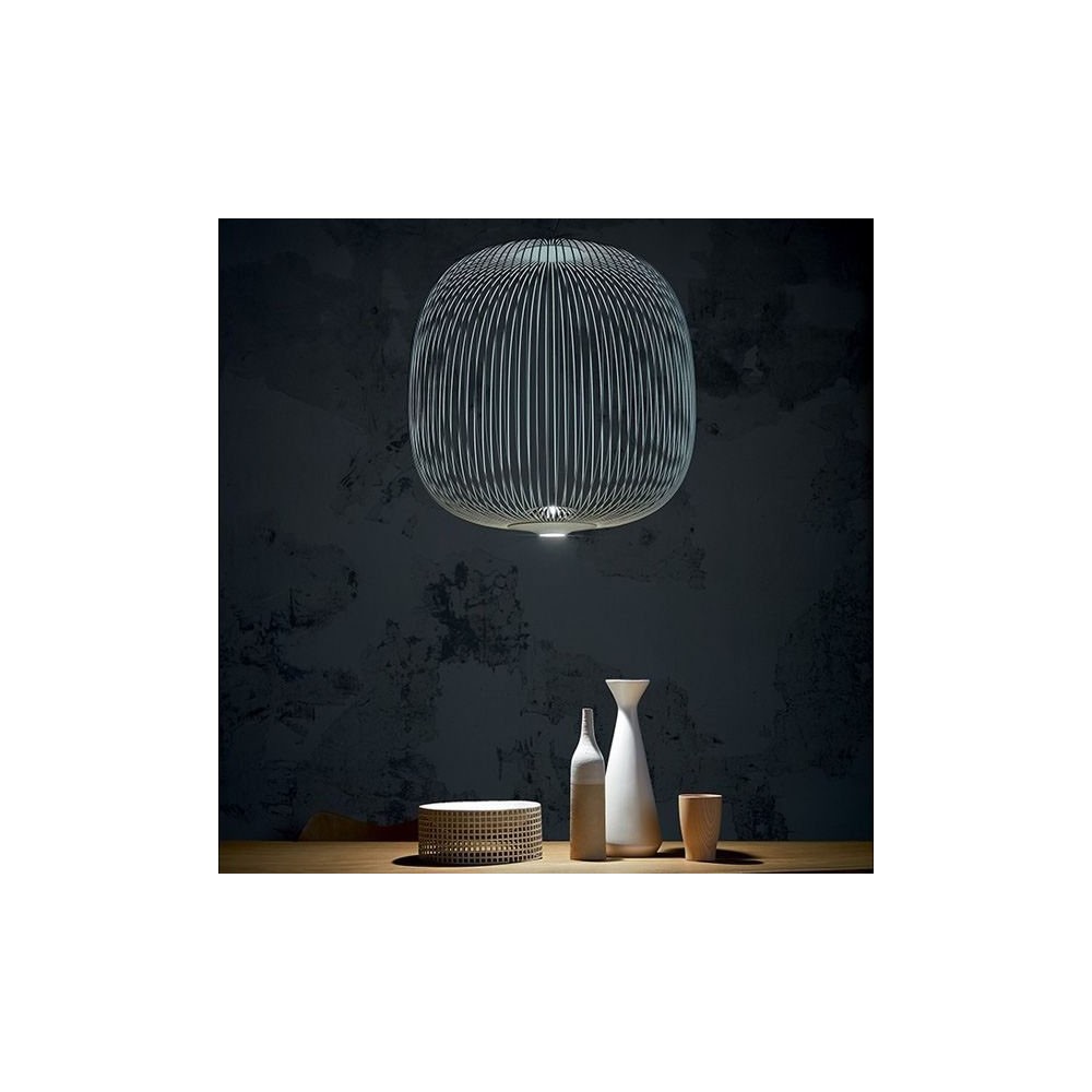 La struttura è composta da sottili fili metallici arcuati in acciaio e alluminio verniciati, disponibili in diverse finiture. Al suo interno, una sorgente LED integrata da 30W (2700 K, 3316 lm, CRI>90, inclusa) diffonde una luce morbida e uniforme, senza abbagliare e valorizzando arredi e materiali circostanti. Il diffusore traforato permette l’illuminazione sia verso il basso che sulle pareti, mentre il cavo di sospensione regolabile in altezza rende la lampada versatile per ogni contesto. Dimensioni: diametro 52 cm, altezza corpo 41 cm.