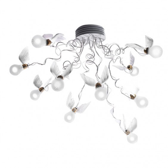 Un intreccio di leggerezza e poesia prende forma nella lampada a sospensione Birdie's nest led, dove dodici piccoli punti di luce sembrano librarsi come uccelli appena posati su un nido sospeso. Le ali in vere piume d’oca, applicate a ciascuna lampadina, creano un movimento impalpabile e onirico, mentre la struttura filiforme in metallo disegna una silhouette eterea e scenografica. L’atmosfera che nasce da questa composizione è calda, avvolgente, capace di trasformare ogni ambiente in una scenografia luminosa dal forte impatto visivo e dal fascino contemporaneo.