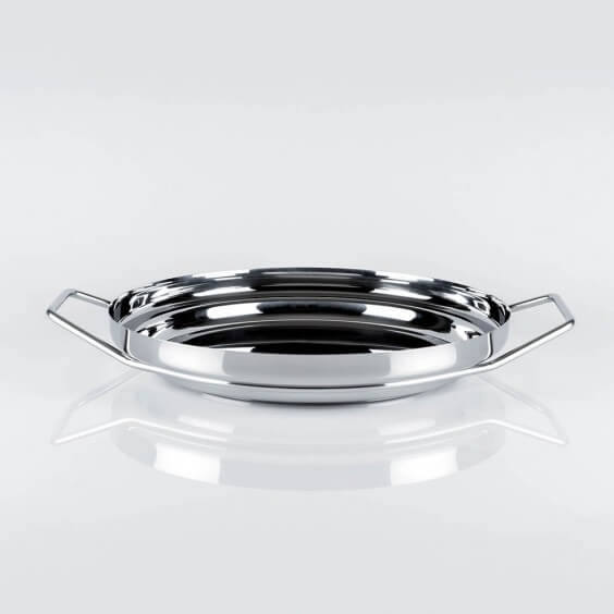 Realizzazione interamente in acciaio inox, con superficie rifinita a specchio per garantire resistenza e facilità di pulizia. Il rivestimento in acciaio assicura durabilità e mantiene inalterate le proprietà organolettiche degli alimenti durante la cottura. La struttura compatta della Back Up padella - vassoio consente un utilizzo versatile sia come padella sia come vassoio, adattandosi alle diverse esigenze di preparazione e servizio. Il bordo rialzato offre stabilità agli alimenti, agevolando il trasferimento dalla cucina alla tavola senza dispersioni. Compatibilità totale con piani cottura a gas, elettrico, induzione, ceramico, alogeno e forno, per la massima flessibilità d’impiego. Il bilanciamento tra spessore e peso rende la presa sicura e maneggevole, facilitando l’utilizzo quotidiano. L’essenzialità delle linee, priva di interruzioni, valorizza il design della padella / vassoio Back Up, permettendo una transizione fluida tra le funzioni. Il progetto KnIndustrie Back Up risponde a criteri di sobrietà e funzionalità, con attenzione ai dettagli tecnici e alla praticità d’uso.
