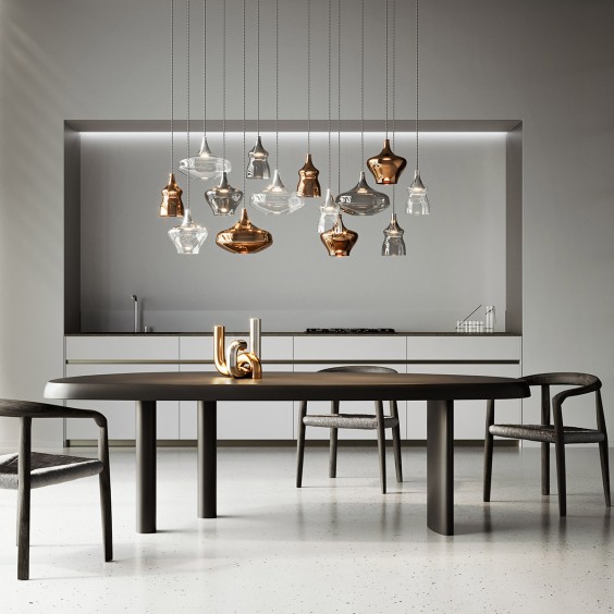 Realizzata in vetro soffiato artigianalmente e disponibile in diverse finiture, Nostalgia Medium sospensione misura circa 20 cm di diametro e 28 cm di altezza. Il LED integrato da 7W (2700K, 1280lm, CRI90) offre un’illuminazione d’accento diffusa e regolabile, perfetta per tavoli da pranzo, penisole, banconi o composizioni multiple. Il cavo di sospensione regolabile fino a 300 cm e l’alimentatore elettronico incluso garantiscono massima versatilità, rendendo questa lampada ideale per cucina, soggiorno, ristoranti, lounge e hall di hotel.