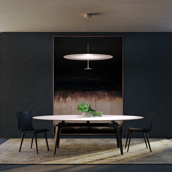 Dot 1100 sospensione di Lumina, firmato Foster+Partners, interpreta con precisione e leggerezza il concetto di luce come elemento architettonico. La sua struttura, composta da due dischi in alluminio verniciato, si distingue per le proporzioni calibrate e l’eleganza minimale: il disco superiore, ampio e sottile, accoglie la luce diffusa che si rifrange dal disco inferiore, più compatto, in cui è integrato un anello LED ad alta efficienza.La sorgente luminosa – disponibile in versione 52W 3000K 2020lm o 52W 2700K 1950lm, con un indice di resa cromatica superiore a 90 – garantisce un’emissione morbida e avvolgente, priva di ombre nette, ideale per valorizzare ambienti contemporanei o classici come soggiorni, camere e cucine. Il collegamento centrale, affidato a un sottile tubo metallico, conferisce alla Dot 1100 lampada a sospensione una presenza quasi eterea, accentuando la sensazione di un volume che fluttua nello spazio.Dot 1100 Lumina rivela una sintesi tra rigore formale e tecnologia illuminotecnica avanzata, restituendo una luce uniforme che dialoga armoniosamente con l’architettura degli interni, senza mai risultare invasiva. Pensata per chi ricerca una soluzione sospesa capace di coniugare estetica essenziale e prestazioni illuminotecniche di livello professionale.