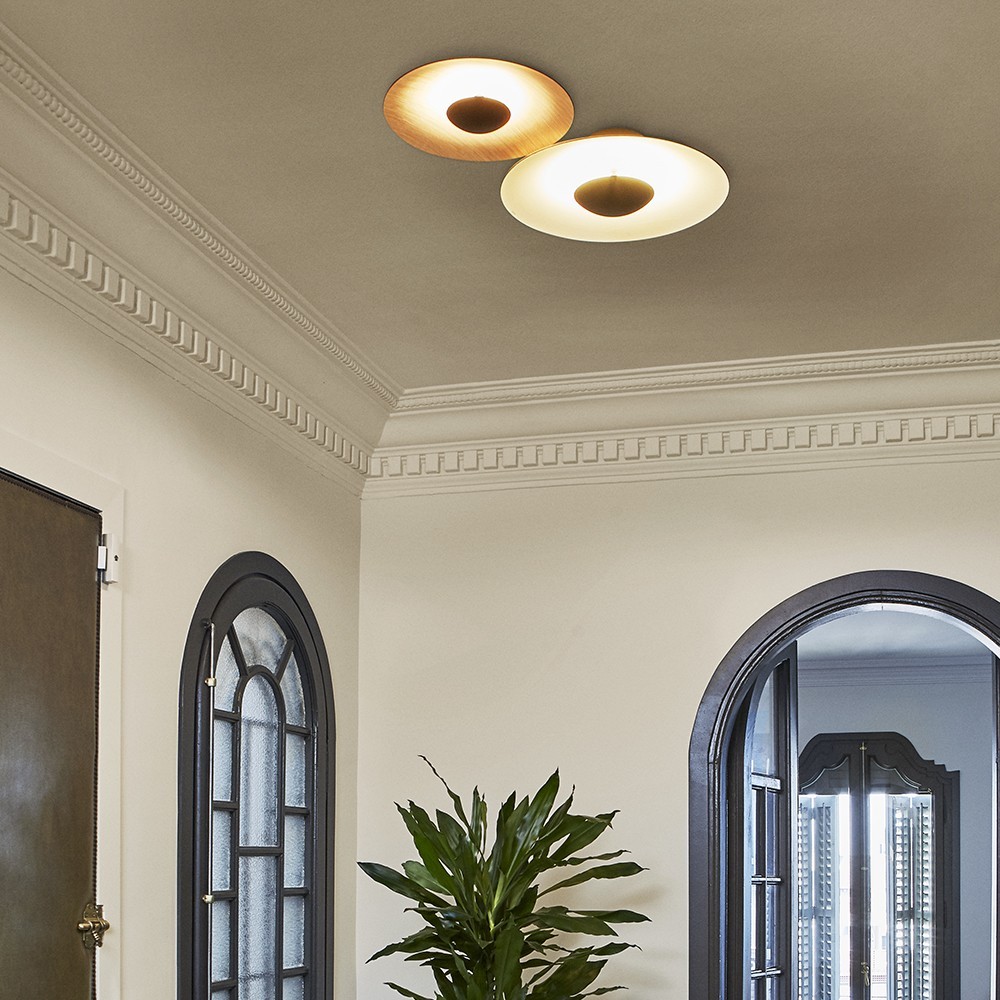 Ginger è una lampada a soffitto che fa parte di una famiglia di lampade eleganti e innovative. Il legno è un grande alleato dell'illuminazione accogliente. È un materiale difficile da plasmare, una sfida che la collezione Ginger risolve in maniera impeccabile. La combinazione di fogli di legno, carta e resine pressati insieme ad alta pressione ottiene un laminato che appare quasi completamente piatto, che illumina discretamente gli spazi con luce indiretta.