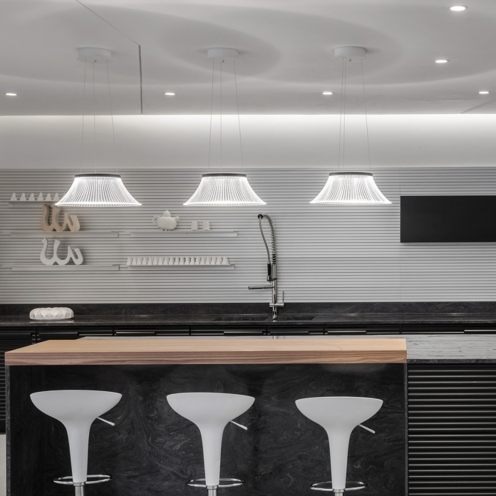 Dotata di una sorgente luminosa LED integrata da 11,5W (1150lm, 3000K), Plissé sospensione offre un’illuminazione morbida e omogenea, ideale per valorizzare tavoli da pranzo, zone living e ambienti contract. Il diffusore circolare in policarbonato opalino, abbinato ai sottili cavi di sospensione, garantisce versatilità d’uso e leggerezza visiva. Dimensioni generose (diametro circa 55 cm, altezza circa 20 cm) e alimentatore elettronico incluso rendono questa soluzione perfetta per soggiorni, cucine, uffici di rappresentanza e spazi hospitality.