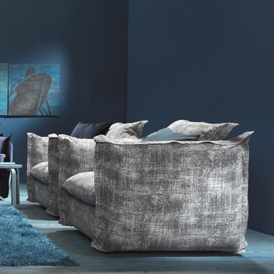 Struttura in legno ricoperta in gomma poliuretanica indeformabile e fodera in fibra di poliestere. Cuscini spalliera in piuma d'oca e seduta in gomma poliuretanica e trapunta in piuma d'oca sterilizzata. Riverstimento in tessuto sfoderabile.