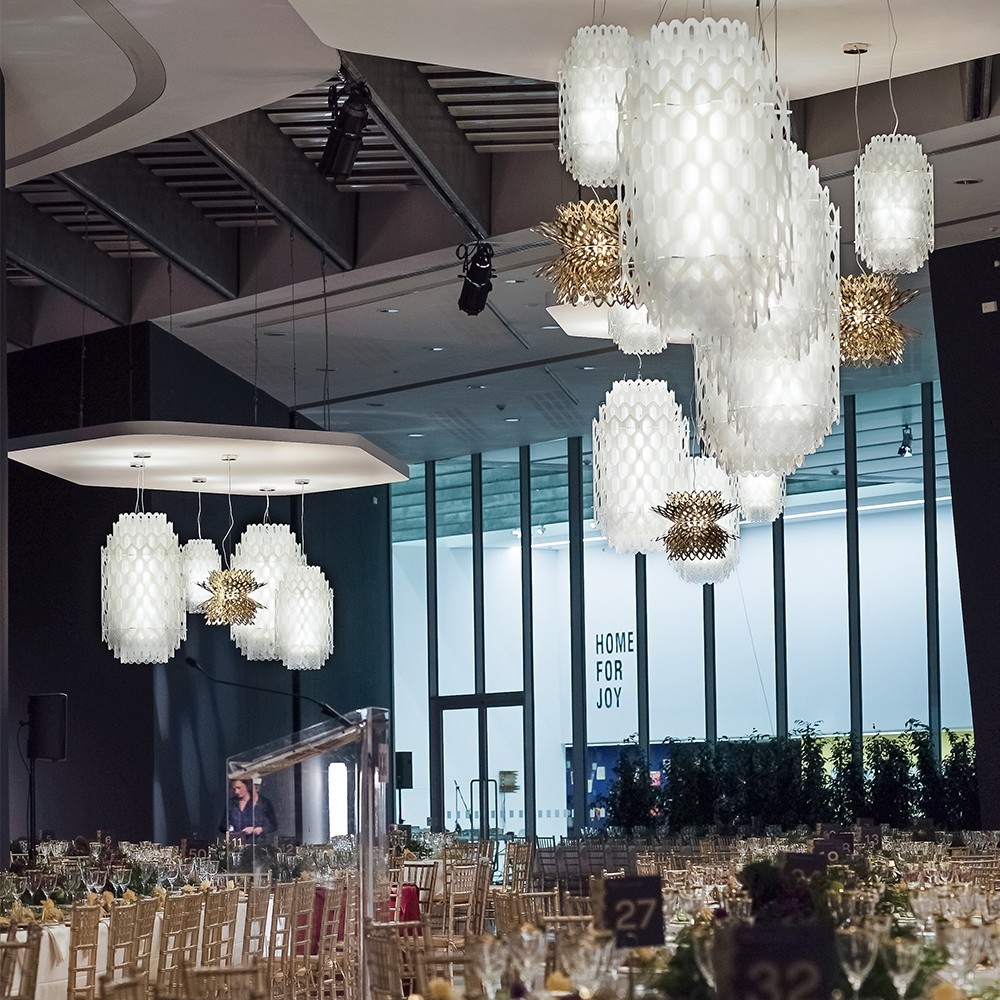 La Chantal sospensione di Slamp, firmata Doriana Fuksas, trasforma la luce in una presenza poetica che ridefinisce lo spazio con eleganza e rigore.
