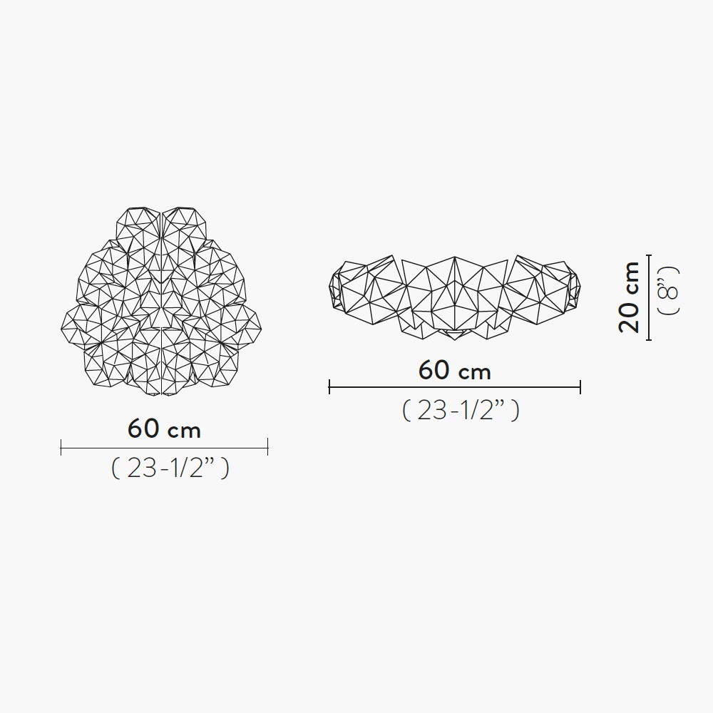 Realizzata in Lentiflex®, materiale brevettato da Slamp dalla texture cangiante e vellutata, la Drusa offre una straordinaria diffusione della luce. Le dimensioni generose (diametro 60 cm, profondità 20 cm) e il peso contenuto (circa 2,4 kg) consentono una facile installazione a parete o soffitto. La sorgente luminosa (4x12W E27, lampadine non incluse) garantisce una luce potente e omogenea, ideale per soggiorno, camera da letto, cucina o bagno. La classe di protezione IP20 la rende perfetta per ambienti interni dove si desidera un’illuminazione d’accento o diffusa.